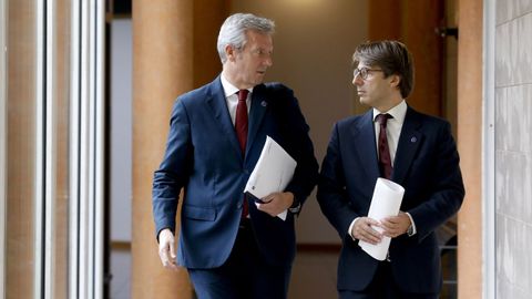 Rueda estuvo acompañado en la presentación por el conselleiro de Facenda, Miguel Corgos, que detalló el texto presupuestario.