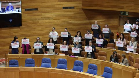 La sesión plenaria ha estado marcada también por las discrepancias de los grupos a la hora de fijar una posición sobre la guerra de Irán. Los diputados nacionalistas, que presentaron su iniciativa para una declaración institucional (en la que se oponían a enviar la fragata española Cristóbal Colón a Chipre y pedían la salida de la OTAN), han mostrado pancartas en las que se leía Non á guerra. Imperialismo nunca máis. Al inicio del pleno, Pontón ha pedido al PP «non repetir a foto criminal dos Azores» y emplazó a Rueda a ponerse del lado de la paz, «do lado correcto da historia». «Deixe de renderlle pleitesía aos EEUU e a Trump, denuncie a violación do dereito internacional e diga non a esta guerra criminal e inxusta», demandó la líder nacionalista.
