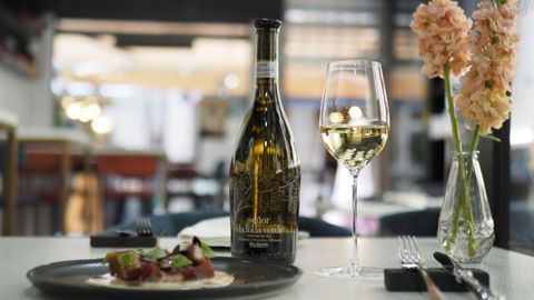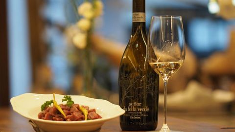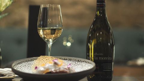 Para el maridaje nos recomiendan el vino Señor da Folla Verde (Condado do Tea, 70% albariño, 15% loureira, 15% treixadura; D.O. Rías Baixas) de Bodegas Marqués de Vizhoja. «Tenemos dos sabores complejos, por lo que necesitamos un vino que los acompañe, que limpie la grasa del atún y que aporte un valor afrutado», indica Rubén.