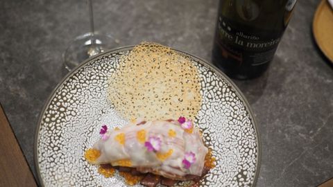 «De nuevo, apostamos por un plato bastante graso, que se incrementa con la papada. Por ello repetimos maridaje con el vino Torre la Moreira, cuya uva, totalmente albariño, tiene la acidez justa para rebajar un plato tan untuoso», señala Rubén.