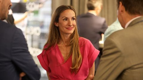 La hermana de la reina no solo eclipsó a Robert Gavin con su simpatía, sino también con su imagen. Telma Ortiz se mostró deslumbrante con un vestido cruzado en color rosa fucsia de Mango, bolso tipo shopper de piel en color beige y salones de vinilo transparentes al tono, además de su larga melena lisa.