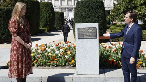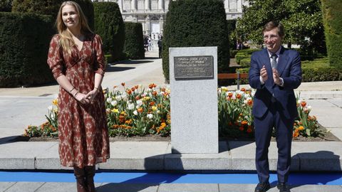 Acompañada por el alcalde de Madrid, José Luis Martínez-Almeida, la heredera al trono de los Países Bajos recorrió el jardín de tulipanes plantados el pasado mes de noviembre por el embajador neerlandés en España, Roel Nieuwenkamp, junto al regidor.