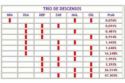 Las dos opciones restantes envían a Segunda a Mallorca, Deportivo y Osasuna, con un 0,48 % de posibilidades en un caso. En el otro, cambian a los baleares por el Zaragoza (0,07 %).