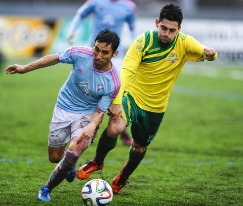 Desde un primer momento fue el conjunto gallego quien saltó al campo con ánimo de llevar la iniciativa del encuentro. A los once minutos dispuso de una clara ocasión para haberse adelantado en el marcador, tras una buena combinación entre varios futbolistas vigueses que finalizó con un centro de Puchetta desde la derecha que remataba Borja Iglesias al larguero. Un minuto más tarde fue Señé quien lanzó una falta desde el borde del área que salió rozando el larguero. En el minuto 26 el canario Omar se fue con calidad de varios contrarios, cedió a Puchetta que de nuevo centró al área para que Señé rematara desviado.