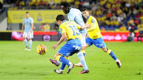 Ganar las disputas, anticiparse, robar y encontrar espacios para salir eran las consignas de los hombres del centro del campo vigués y cumplieron con ello. El problema fue que todo se torció cuando el Las Palmas se desató y el Celta se vio con la mitad de su equipo arrastrando tarjetas. El gol de cabeza de Bigas sentó mal a los celestes, que en vez de recordar que todavía tenían margen, se dejaron llevar por el frenesí. Y de ese caos partió la segunda amarilla a Sergi Gómez y de ahí nacieron más dudas.