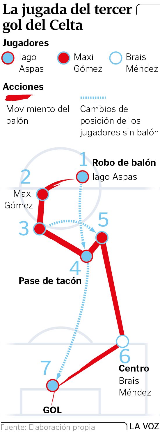 Corre el minuto 78. El Betis tiene el balón y se interna en campo celeste. Iago Aspas, convertido por obra y gracia de sus ganas y esfuerzo en todocampista, consigue interceptar la pelota en pleno círculo central y lanza la ofensiva. Maxi Gómez, que ha incorporado a su repertorio la obligación de defender, se encuentra cerca del moañés, por lo que Iago le da el balón para poder iniciar carrera. El uruguayo, sorteando las piernas del bético Fabián, devuelve el esférico a Aspas, que, en una soberbia acción de tacón, entrega de nuevo la pelota para que Maxi avance y vea a Brais subiendo por la banda izquierda.