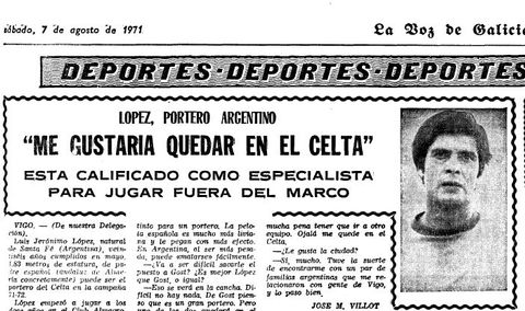 26 nov 2020 . Actualizado a las 17:35 h.El exfutbolista argentino Luis Gerónimo López, nacionalizado colombiano y que llegó a ser arquero de la selección cafetera, falleció este jueves a los 75 años en Bogotá, informaron fuentes deportivas. Tuvo un breve paso por el Celta en el verano de 1971, cuando llegó a prueba y disputó algunos amistosos, aunque finalmente no llegó a convencer al club y no pudo quedarse.