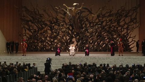 10.59 | Ya hemos entrado y estamos esperando a que llegue el papa Francisco. Bastante caos, los gendarmes vaticanos no dejan a acceder a la mitad del aula a pesar de que está vacía.