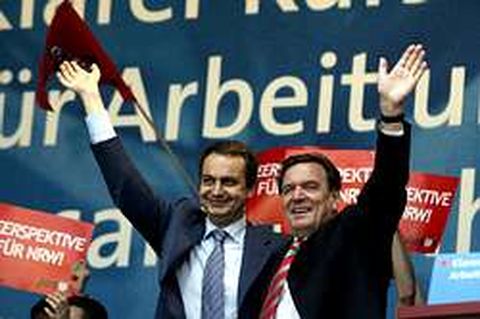 20 may 2005 . Actualizado a las 07:00 h.La campaña electoral en el land de Renania del Norte-Westfalia tuvo ayer acento español. José Luis Rodríguez Zapatero viajó a Dortmund para participar junto al canciller Gerhard Schröder en el cierre de campaña del Partido Socialdemócrata (SPD), que gobierna este estado desde hace 39 años. Zapatero, al que Schröder fotografió con un grupo de españoles -Renania es el estado que más españoles acogió durante los años de la emigración-, se mostró confiado en la victoria del SPD mañana en las urnas porque «el futuro está al lado de la izquierda, de los valores más poderosos para la paz y la solidaridad y para que aquellos que tienen menos tengan voz para que haya una distribución equitativa del progreso». Para él, los valores de la derecha «sólo cotizan en bolsa». Zapatero rindió homenaje al ex canciller Willy Brandt por la ayuda que prestó al PSOE durante la transición. El presidente ha querido devolver en Dortmund el favor a Schröder, por la ayuda que el canciller le prestó durante la campaña del referéndum de la Constitución europea. Pero el SPD no fue el único partido que recurrió ayer a sus principales espadas para tratar de movilizar al 42% de indecisos que hay de los 13,3 millones de alemanes con derecho a voto en el land más poblado e industrializado de Alemania. El líder de los Verdes, Joschka Fischer, la conservadora Angela Merkel y el liberal Guido Westerwelle también viajaron a este estado con un millón de parados para pedir el voto para sus respectivos candidatos. Pero son los socialdemócratas los que más se juegan en estas elecciones. Una derrota en Renania del Norte-Westfalia supondría un duro varapalo para Schröder, que desde que ganó las elecciones generales por los pelos en septiembre del 2002 ha visto como su partido encaja derrota tras derrota en los comicios regionales. Los resultados tendrán una lectura federal. Supondrá la consolidación de Angela Merkel como candidata de la CDU-CSU a las generales del 2006. Y marcará el principio del fin de la coalición rojiverde que gobierna Alemania.