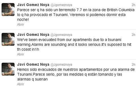 A través de las redes sociales, Gómez Noya envió un mensaje de tranquilidad. «Hemos sido evacuados de nuestros apartamentos por una alarma de tsunami. Parece serio, por las medidas que están tomando y las alarmas que suenan. (...) Veremos si podemos dormir esta noche». Tres horas después, regresaban a su hotel, sin saber con exactitud como podría ser la carrera, prevista para las 9 de la mañana hora local. En principio se barajó la posibilidad de que la prueba (1,5 kilómetros a nado, 30 de ciclismo de montaña y 9,5 de carrera pedestre por un terreno escarpado) prescindiese del sector en el mar. «Javier dice que el nivel del mar subió un metro en algunos sitios de la isla, pero no saben como está la playa, ni el tipo de fauna o materiales que el mar pudo arrastrar», explica el padre del triatleta.