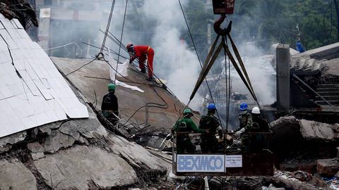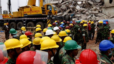 Los equipos de rescate han comenzado a usar maquinaria pesada para limpiar los escombros del inmueble que alojaba cinco talleres textiles en la localidad de Savar, en las cercanías de Dacca, cinco días después del siniestro. Hasta el momento 2.437 personas han sido rescatadas de entre los escombros.
