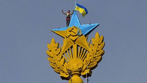 Una imagen difundida en redes sociales --cuya autenticidad no ha sido verificada-- muestra a un hombre ataviado con material de escalada encima de la estrella y junto a la bandera ucraniana. El hombre parece estar sacándose un 'selfie'.