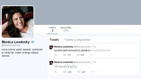 La exbecaria de la Casa Blanca también abrió una cuenta en Twitter presentándose como una «activista social», que colabora con la revista Vanity Fair y tiene una pasión por el tejido de punto. «#AquiVamos», escribió escuetamente en su primer tuit @MonicaLewinsky, quien en cuestión de horas ya sumaba 18.000 seguidores.