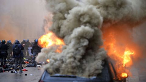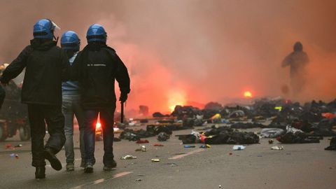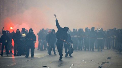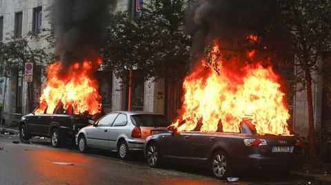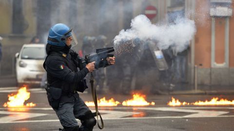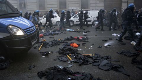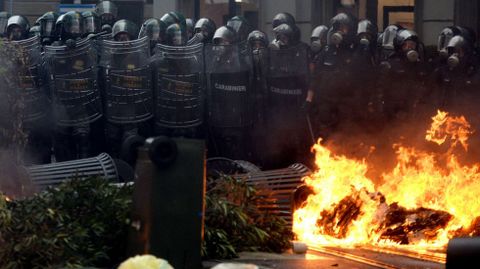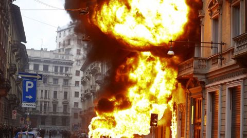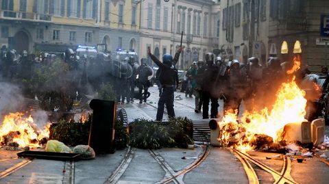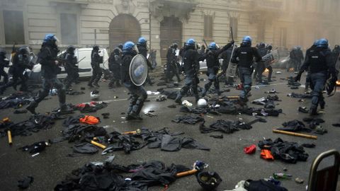 Aún así, fue una batalla campal. Resultaron incendiados catorce vehículos mientras eran numerosos los escaparates rotos. Una oficina del Banco Nacional del Lavoro se llevó la peor parte ya que fue pasto de las llamas. Los manifestantes también detruyeron semáforos y mobiliario urbano mientras lanzaban cócteles Molotov contra la policía. Los antidisturbios tuvieron que intervenir con varias cargas y en los choques fueron heridos once agentes. Algunos violentos aprovecharon la confusión y el humo para abandonar bastones, cascos y la ropa oscura y escapar confundidos en medio de otros manifestantes, lo que hace pensar que formaban parte de una guerrilla perfectamente organizada. Fueron detenidas entre 20 y 30 personas.