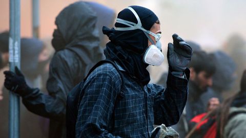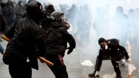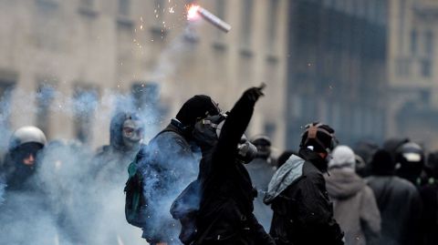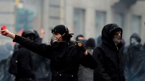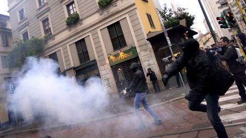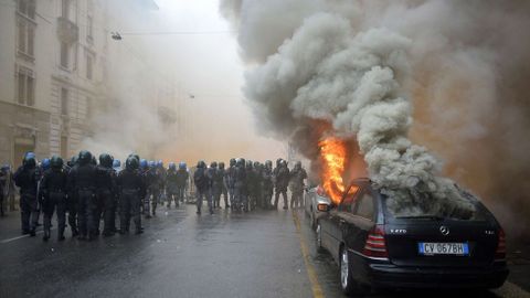 Junto a los manifestantes pacíficos, unos 10.000 aproximadamente, se infiltraron grupos antisistema y anarquistas de ideología anticapitalista, conocidos como «black bloc», en total unos 500, en su mayoría jóvenes, que habían llegado de varios países europeos. A la altura de la calle Magenta estos activistas, encapuchados con cascos, máscaras antigas y vestidos de negro, empezaron a lanzar piedras y petardos contra la policía, que respondió disparando cañones de agua y arrojando gases lacrimógenos. Esto hizo que los manifestantes se dispersaran en grupos pequeños para diseminar el caos en otros puntos. Gracias a que la policía estacionó furgonetas a lo largo del recorrido de la manifestación para impedir que los antisistema alcanzaran otras zonas del centro, los disturbios tuvieron lugar sobre todo entre las calles Carducci y Magenta.