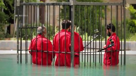 En otra parte de la grabación, se ve a milicianos que introducen en el interior de una jaula -como la empleada durante la ejecución del piloto jordano secuestrado por el grupo terrorista- a cuatro presuntos espías a los que a continuación se sumerge en una piscina para que se ahoguen. Posteriormente, se ve de nuevo la jaula con los prisioneros muertos.
