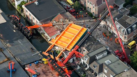 04 ago 2015 . Actualizado a las 17:58 h.Dos grúas que sostenían una enorme placa de cemento destinada a la renovación de un puente cayeron el lunes sobre edificios de una calle comercial de Alphen aan den Rijn (oeste de Holanda) sin causar víctimas, anunciaron las autoridades locales.
