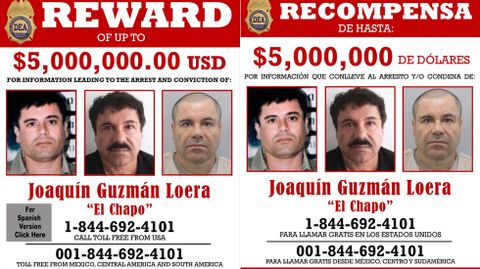 El Gobierno de Estados Unidos ofrece 5 millones de dólares por información que lleve a la captura del narcotraficante Joaquín El Chapo Guzmán, líder del Cártel de Sinaloa. Este mismo miércoles ha publicado un cártel para su búsqueda, con la imagen del fugitivo -para el que reclaman la extradición-, y ha activado una línea telefónica gratuita.