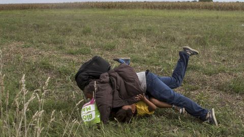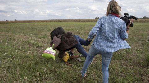 Despedida Petra Lazlo, la cámara que zancadillea a traición a un refugiado sirio corriendo con su hija en brazos