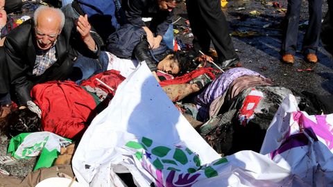 11 oct 2015 . Actualizado a las 09:44 h.En solo unos segundos, los kurdos de Turquía revivieron ayer los atentados de junio en Diyarbakir, dos muertos en un mitin del Partido Democrático de los Pueblos (HDP), y de julio en Suruc, otras 32 vidas segadas, y se convirtieron en las principales víctimas del mayor atentado de la historia moderna del país. Al menos 95 personas perdieron la vida y cientos resultaron heridas en la doble explosión contra la denominada «Marcha por la paz, el trabajo y la democracia», convocada por sindicatos de izquierda en Ankara para pedir el fin de las hostilidades entre el Gobierno y el Partido de los Trabajadores del Kurdistán, PKK, y en la que tomaba parte la formación kurda HDP. No hubo tiempo para manifestaciones. Dos explosiones casi simultáneas y a muy poca distancia la una de la otra sembraron el centro de la ciudad de cuerpos y comenzaron las protestas contra el Gobierno, al que los organizadores de la movilización culparon de inmediato de la carnicería.