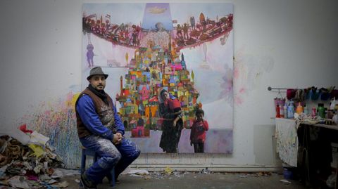 Ali, que estudió Bellas Artes en Damasco, lleva once años en Galicia y hasta ahora huía del tema de la guerra en sus trabajos artísticos. «Mi obra es alegre, me encanta el color... Siempre soy optimista; quiero transmitir esperanza, que hay cosas muy bonitas en el mundo». Durante cinco años ha intentado alejarse del conflicto «hasta que perdí a mucha gente de mi familia, perdí a muchos amigos y como vivo todo eso en mi taller, pues llegó un momento en el que vi que lo mejor era integrarlo en la obra, ponerlo sobre la tela y descargar la presión». Lo cuenta mientras música de su país suena de fondo. Le gustaría exponer estos cuadros, junto con «una instalación y una performance; la idea está clara, falta el espacio...». En realidad no falta, porque piensa que el Kiosco Alfonso, de A Coruña, sería el lugar ideal para estos lienzos de dos por dos metros. Es un proyecto para el próximo año porque aún tiene pocos cuadros. «El arte al final es un mensaje, tiene que ser una llamada de atención, sensibilizar a las personas a través de él, es una forma de educar a la gente, que vea lo que está pasando».