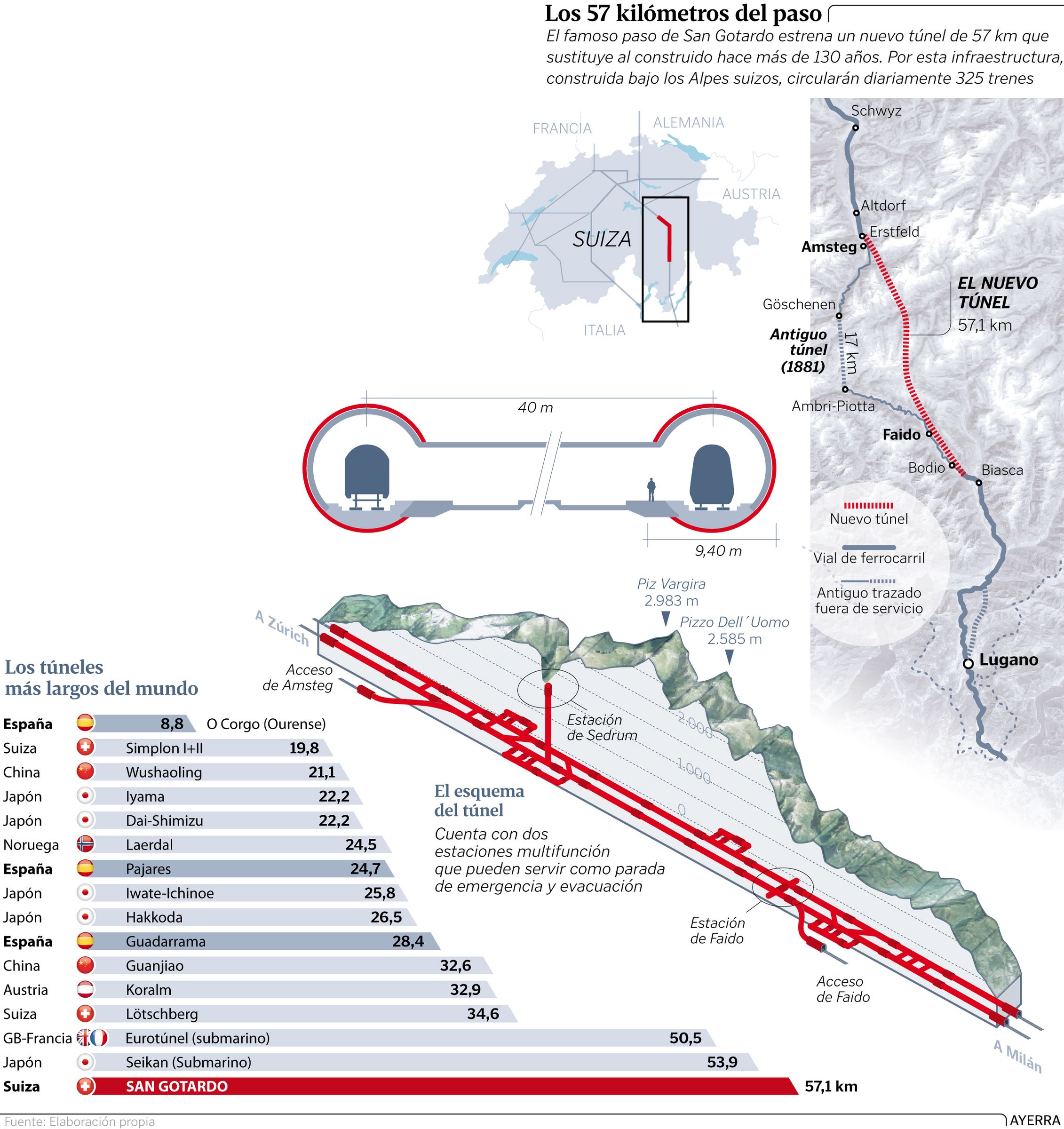 02 jun 2016 . Actualizado a las 07:32 h.Casi veinte años de obras, 2.400 obreros en tres turnos diarios, tres años de pruebas y controles de seguridad, 12.000 millones de francos -unos 11.800 millones de euros al cambio actual- 57 kilómetros y trenes de última generación para acortar en una hora y media el tiempo de viaje entre Zúrich y Milán, dos de las grandes ciudades centroeuropeas, ejes del tránsito de personas y mercancías entre el norte y el sur del continente. Esas son algunas de las cifras del túnel del Gotardo, que ayer se inauguró oficialmente y que desde hoy entra en servicio a casi 2,5 kilómetros bajo la tierra, mejor dicho, la roca, de los Alpes Lepontinos, entre las localidades de Erstfeld y Polleguio, y que permitirá que transiten por sus tripas 325 trenes diarios, 260 de mercancías y 65 de pasajeros, a velocidades punta de hasta 250 kilómetros por hora.