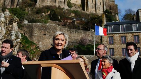 Le Pen mantiene su gira electoral por el oeste del país ajena a las protestas que suscita su presencia. Ayer acudió a otro mitin en el Monte Saint Michel, en Bretaña, ante cuyo monumento histórico pronunció un discurso de tintes profundamente nacionalistas. «Vamos a hacer que nuestros hijos amen Francia», martilleó ante sus seguidores de la isla, una «maravilla de Occidente» para la candidata. El secretario del partido, Nicolas Bay, que acompañó a Le Pen en su visita, fue más preciso con el concepto de Francia que Le Pen pretende que los franceses amen: «El Monte Saint Michel, símbolo de una Francia que se basa en sus raíces cristianas con fuerza y grandeza», escribió en su Twitter.