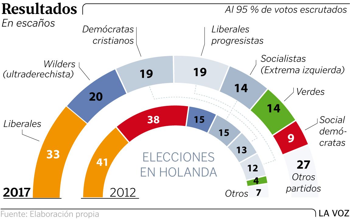 Empatados a escaños (19), los demócratas cristianos de la CDA y los liberales de centro del D66 aspiran a formar parte del próximo Gobierno. Ambos se han alimentado de la pérdida de popularidad y la caída en desgracia de algunos partidos tradicionales. El Partido Socialista (SP), pierde un escaño y se quedará en los 14, los mismos que cosechó el carismático líder de los verdes, Jesse Klaver, catapultando al GroenLinks a una posición clave en el Parlamento. ¿Alguien echa en falta a la socialdemocracia? El PvdA, que fuera segunda fuerza en las elecciones del 2012 con 38 diputados, se hunde en la séptima posición con solo nueve escaños. Sus votantes no perdonan los cuatro años de complicidad con las políticas neoliberales de su socio, el VVD de Rutte. La factura en las urnas traerá consecuencias duras para el partido y dificultará las negociaciones para formar nueva coalición. Con la piel en carne viva, el líder del partido, Lodewijk Asscher, sopesa renunciar y pasar a la oposición.