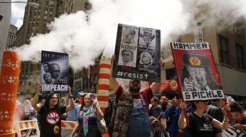 Nueva York se convirtió en el epicentro de las bautizadas como «Marchas de la verdad». Entre los carteles del público, encabezado por una gran pancarta que simplemente decía «Pedimos la verdad», se pudieron leer numerosas demandas en cuanto al supuesto nexo entre el Gobierno ruso y las elecciones de 2016, pero también sobre la transparencia de Trump respecto a sus impuestos.
