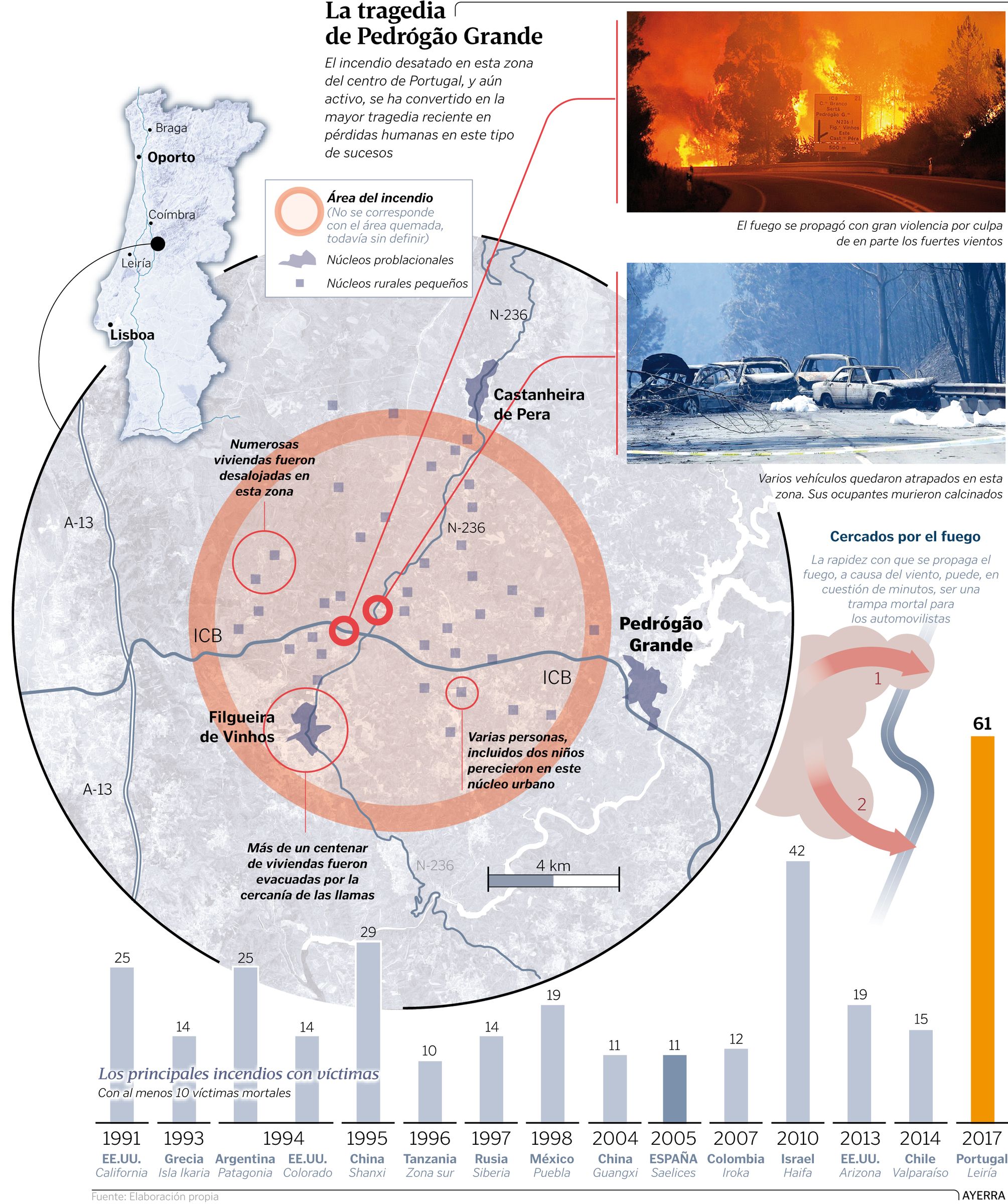 Ese fue el mayor problema. La oscuridad -los que optaron por salir de sus casas lo hicieron después de la medianoche- y el humo impedían intuir el rapidísimo avance de las llamas avivadas por lo que algunos testigos compararon con un tornado. Se propagaron de forma «que no tiene explicación», llegó a decir João Gomes, el secretario de Estado de Administración Interna, encargado de informar de la evolución del suceso que ha conmocionado a Portugal, donde se han declarado tres días de luto.