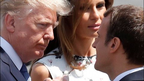 Quedará el recuerdo de sus palmaditas en la espalda y los cálidos y prolongados apretones de manos en todo tipo de posiciones. Donald Trump y Emmanuel Macron volvieron a escenificar ayer una gran complicidad durante el desfile militar de la Fiesta Nacional francesa en París. El inquilino del Elíseo, en un breve discurso antes de despedir a su huésped, afirmó que «nada separará jamás» a sus dos países». La frase se vio correspondida con las repetidas muestras de que disfrutaba durante el desfile a cargo de su homólogo en la Casa Balnca. Trump intercambió de forma reiterada comentarios y confidencias con Macron mientras los aviones surcaban el cielo, pero también durante el desfile en tierra. El otro gesto de concordia, los miembros de la tribuna se levantaron de sus asientos al paso de la bandera de Estados Unidos, momento en el que Trump hizo el saludo militar, mientras Macron aplaudía desde el palco.