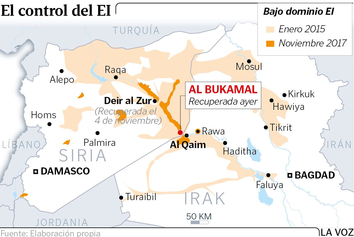10 nov 2017 . Actualizado a las 05:00 h.El Estado Islámico lleva meses sufriendo una derrota tras otra. Con la pérdida ayer del último refugio urbano que le quedaba en Siria, Al Bukamal, ya solo retiene el 4 % del territorio en el que estableció su califato hace tres años. Apenas seis días después de perder Deir al Zur, los yihadistas fueron desalojados de Al Bukamal, un pequeña localidad cuyo interés estratégico radica en que se sitúa en un importante paso fronterizo con Irak.