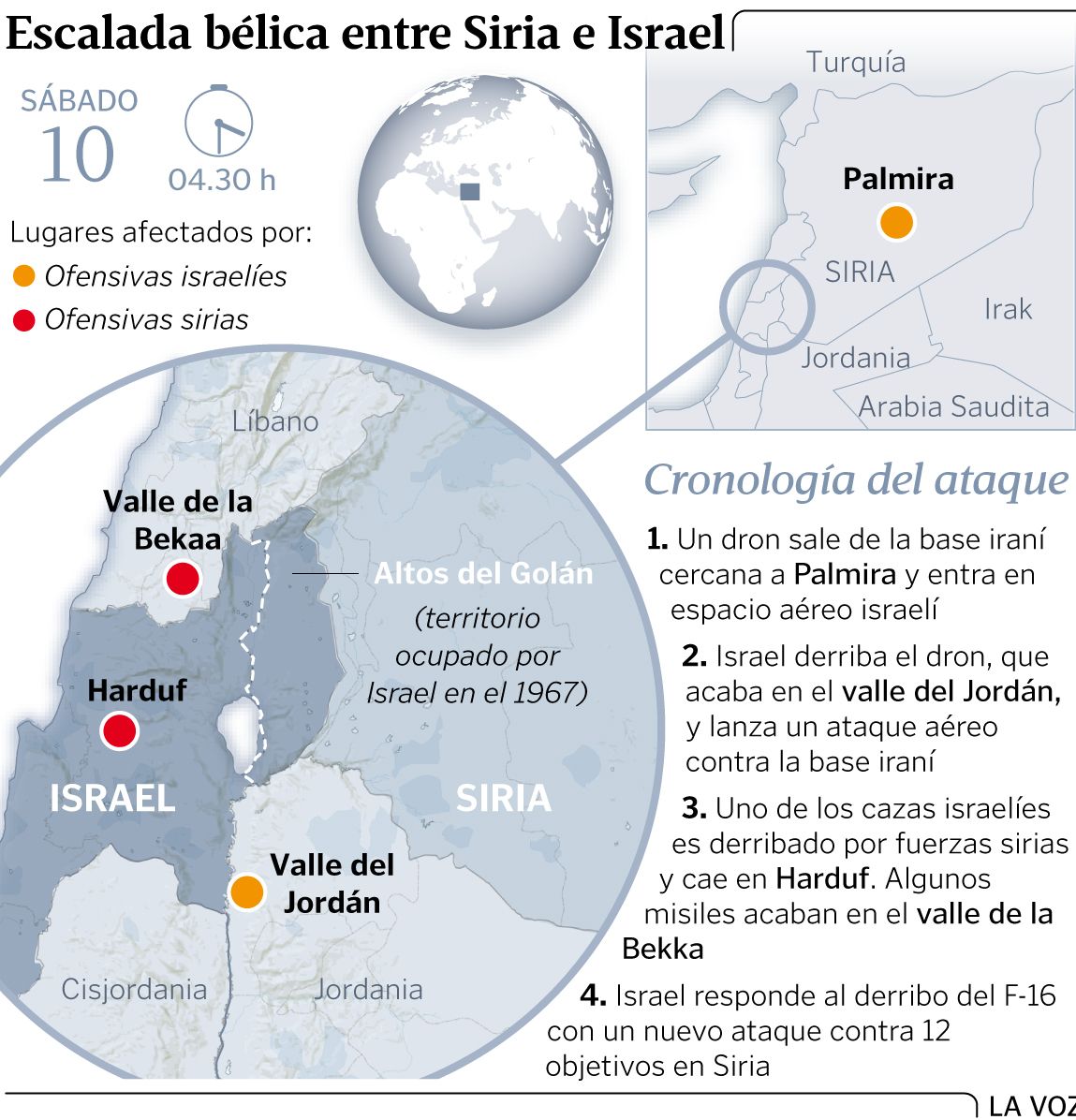 11 feb 2018 . Actualizado a las 05:00 h.La guerra en Siria entra en una nueva fase tras el derribo de un caza de Israel y eleva un poco más la tensión entre Irán y el Estado judío, los dos grandes enemigos regionales. Las baterías antiaéreas sirias funcionaron de forma acertada por primera vez desde el inicio del conflicto y alcanzaron a un F-16 que tomaba parte en una operación contra objetivos iraníes. Los dos pilotos pudieron eyectarse, cayeron en suelo israelí, donde fueron trasladados a un hospital, y el aparato se estrelló en Harduf. El incidente provocó una respuesta inmediata de las fuerzas israelíes que alcanzaron «doce objetivos, entre ellos baterías de defensa aérea y objetivos iraníes que forman parte del establecimiento militar de Irán en Siria», según un comunicado del Ministerio de Defensa que suponía la primera confirmación oficial desde el inicio de la guerra de un ataque israelí contra bases iraníes en Siria. La defensa antiaérea volvió a disparar, pero esta vez no alcanzaron a ningún aparato.