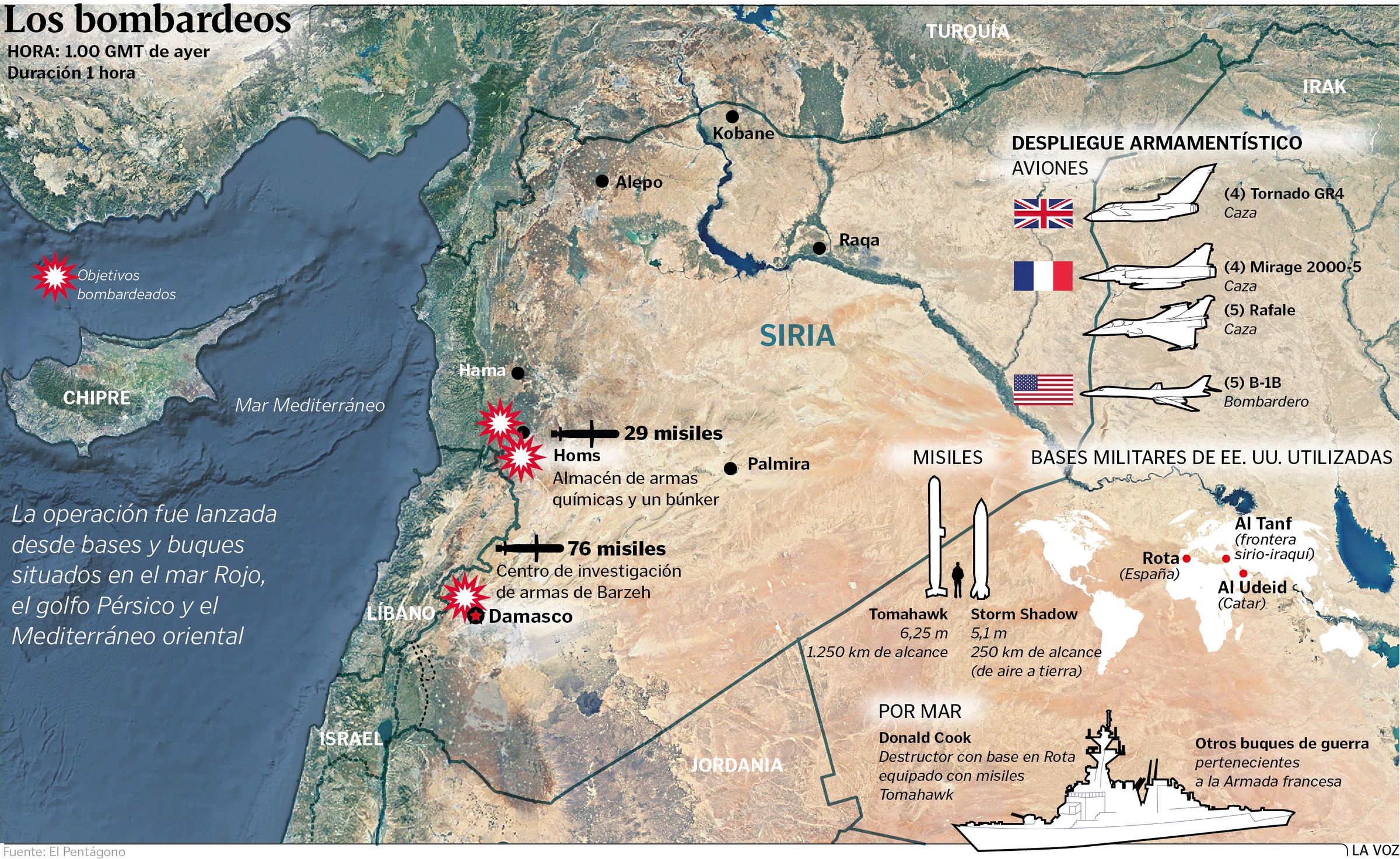15 abr 2018 . Actualizado a las 05:00 h.Moscú admitió que sus instalaciones militares en Siria no resultaron atacadas y señaló que ninguno de sus ciudadanos en el país se vio afectado. Aun así, Vladimir Putin condenó la incursión contra su principal aliado árabe «de la forma más enérgica» y cree que habrá un antes y un después tras lo sucedido. No concretó si su país prepara algún tipo de represalia, pero el embajador ruso en Washington advirtió que el ataque «tendrá consecuencias».