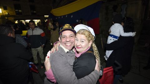 La convocatoria en la Praza da Peregrina partió de la asociación Asovedra, que reúne a representantes de la comunidad venezolana. En la plaza, se fueron congregando muchos portando banderas de su país y alguna que otra camiseta con los colores patrios. En los altavoces sonó el himno nacional y muchos lo interpretaron como pudieron, porque en más de una cara se pudieron ver lágrimas de emoción y voces entrecortadas. A la cita asistió también el vicepresidente de la Diputación y portavoz municipal del PP de Pontevedra, Rafa Domínguez, que horas antes había publicado en un tuit su respaldo al derrocamiento de Maduro. «¡Viva Venezuela libre!», escribió. También estuvo José Manuel Torres, candidato por Vox a la alcaldía de Pontevedra.