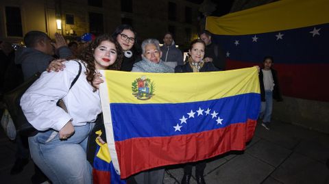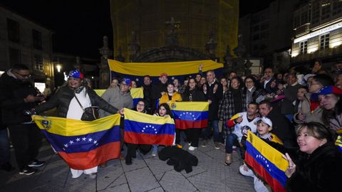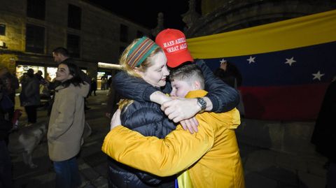 La concentración de venezolanos en Pontevedra acabó con todos los presentes dándose abrazos para felicitarse por la caída de Maduro, esperando que ocurra un cambio de régimen y posando delante de la gran bandera venezolana que destacaba en la plaza en un día difícil de olvidar para muchos de los presentes.