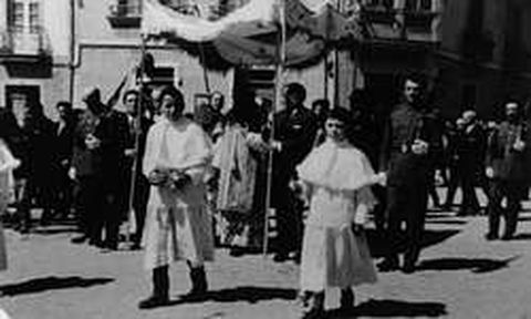 ?a fotografía es de los años sesenta, una época en la que abundaban las procesiones bajo palio. Seguro que don Álvaro , el sacerdote que p r esidió aquel acto religioso en Chantada, agradeció, el palio -y su sombra-, porque de la fotografía se deduce que aquel día apretó el sol. Además de a don Álvaro, de los participantes en la procesión hemos podido identificar también a Chorén , que es el agente de la Guardia Civil que aparece a la izquierda; a José Souto , empleado de la notaría, el primero por la izquierda entre los que sujetan el palio; a Veranio Senra , que asoma la cabeza entre el monaguillo de la izquierda y el cura; y Luis Campo Fernández , a la derecha con el palio, que era el entonces alcalde y también presidía el Círculo Recreativo de Chantada.