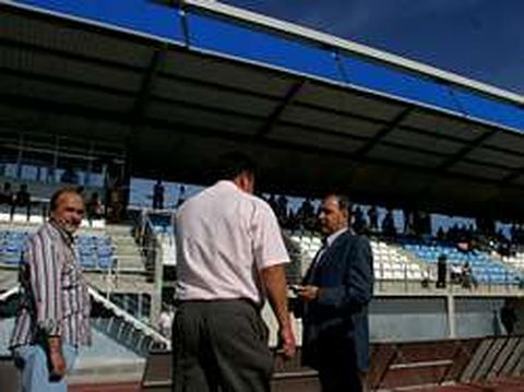 Terra adentro La gran mampara de las gradas del campo de fútbol de A Pinguela se resistió durante un rato a que la inaugurase el concejal de Deportes de Monforte