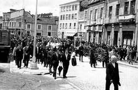 ?l entierro del Rafael Otero Soto fue todo un acontecimiento en la Chantada de finales de los años cincuenta. Rafael Otero había sido alcalde y concejal unos años antes y su entierro movilizó a cientos de vecinos, que acompañaron a la comitiva fúnebre por las calle de la localidad. El fotógrafo captó el paso de los participantes en el funeral por la plaza de Santa Ana. En la foto se aprecia que algunos balcones lucían banderas españolas con crespones negros. Por aquel entonces, en la plazuela todavía estaba abierto el Café Pizarro, en el edificio que hoy ocupa una sucursal de Banesto, y también el hoy reabierto Café Capitol.