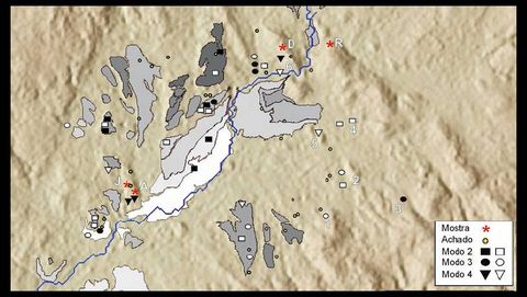 Los puntos señalados con los números 1, 2, 3, 4, 5 y 6 indican la presencia de conjuntos de artefactos descubiertos en los lugares de Caneda, O Bao, Susao, Salgueiredo y A Regueira, Pedrouzos de Mourelos y Agra de Freixo. Los modos 2, 3 y 4 corresponden respectivamente a las tecnologías de las diferentes etapas del Paleolítico, es decir, Inferior, Medio y Superior. Los puntos en rojo señalan los lugares donde, a juicio de los arqueólogos, los antiguos pobladores obtenían las cuarcitas con las que fabricaban sus herramientas de piedra.