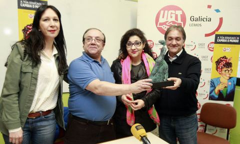 El diputado autonómico del PSOE, Vicente Docasar, exdirector del instituto Daviña Rey y anterior responsable de la Fete en la zona, fue el encargado de entregarle la estatuilla. Estuvo acompañado por su hermano, Mario Docasar, responsable comarcal de UGT, y Berta Milia, orientadora laboral del sindicato que fue la homenajeada el pasado año con motivo del Día Internacional de la Mujer.