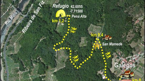 Hay que salir por la carretera LU-617 hacia Chantada. En el kilómetro 5,5 hay un desvío a la izquierda para Buxán, Galegos y Diomondi. Galegos está a 3,3 kilómetros de este desvío, de donde sale una pista de tierra que lleva a la Ribeira de San Fiz. A unos 400 metros está el lugar de San Mamede y a 1,2 kilómetros la Pena Alta y el refugio, a la derecha de la pista