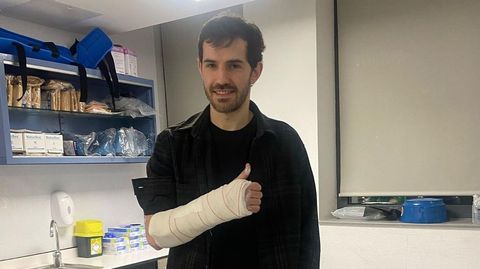 Es la cuarta vez que el jugador chantadino sufre una fractura de radio. El deportista explica como fue esta última. «Na prórroga fixen unha entrada a canasta, cruzouse un xogador de Porriño, fíxome un tapón e polo contacto caín de espalda», dice Noguerol.