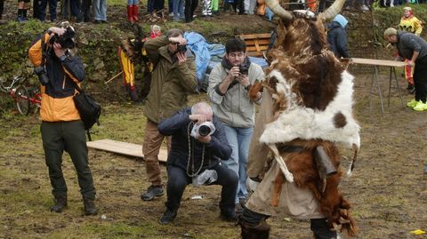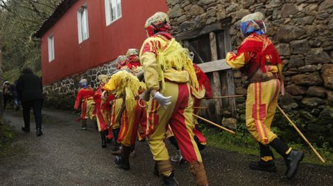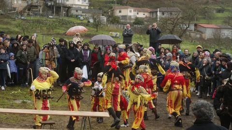 Ayer volvieron a salir con los mayores. Aparecieron puntuales a las cuatro de la tarde junto a la iglesia. Allí se les sumaron los peliqueiros, que tienen que escoltar al pucho en su subida por medio de las huertas hasta el campo de O Moredo. Allí empieza realmente la fiesta, con las representaciones satíricas de los mecos que hacen que el Domingo de Entroido dure toda la tarde.