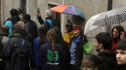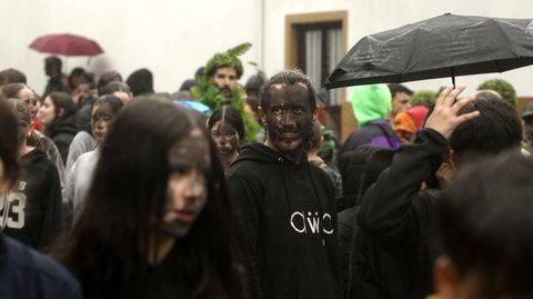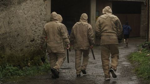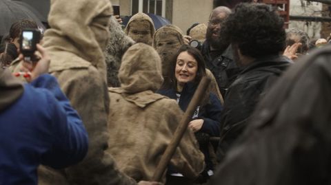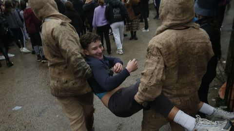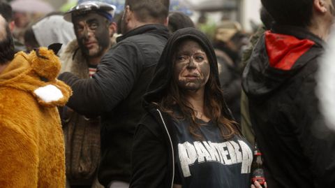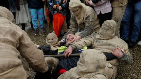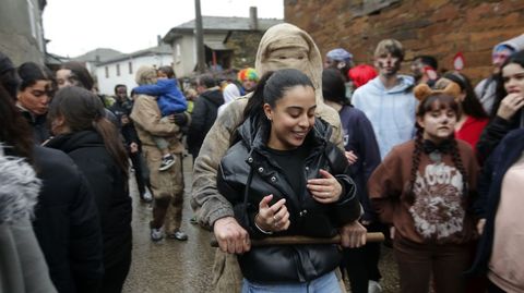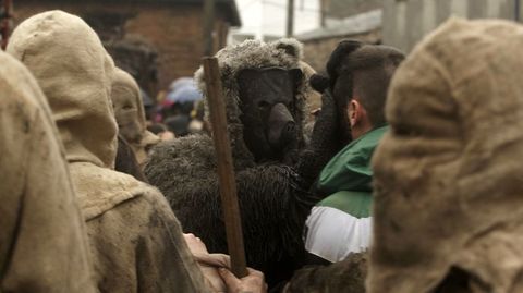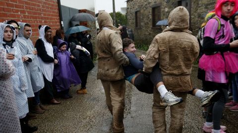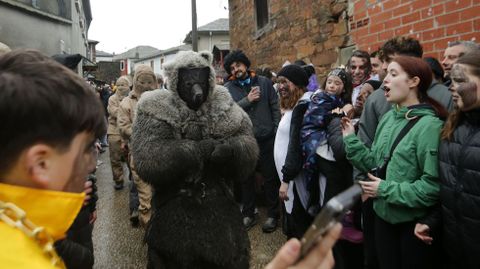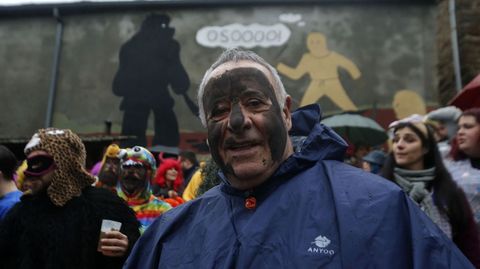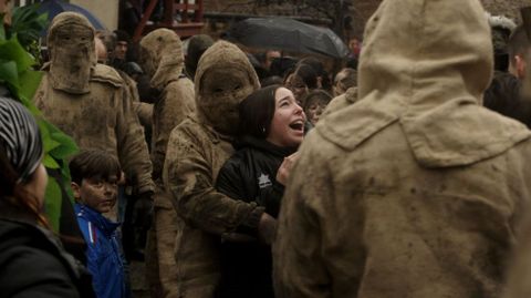 La víctima en esa escena es Rafa Quintía, antropólogo y pregonero de esta fiesta de entroido que se celebra en Salcedo, una de las parroquias del municipio de A Pobra do Brollón, en plena Ribeira Sacra. Con la cara completamente negra con esa mezcla que lleva el Oso de agua ceniza y no se sabe bien qué más, cuenta que si a uno le toca mancharse no hay que enfadarse, sino todo lo contrario. «Acabar manchado polo Oso é unha beizón, vas protexido para todo o ano».