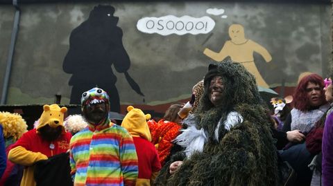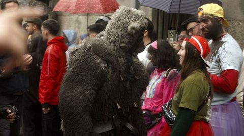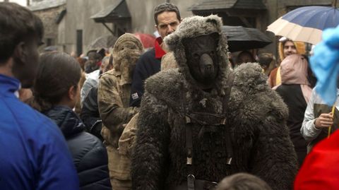 Como todos los lunes de carnaval, el Oso salió ayer por la tarde en Salcedo ayudado por un séquito de criados que son los que se encargan de proporcionarle gente a la que tiznar. Hay otros lugares en Europa que tienen osos como protagonistas centrales de sus carnavales, pero Rafa Quintía asegura que lo que no es habitual es que sean personajes positivos, como asegura que es el de Salcedo. «En Salcedo o Oso é visto como un benfeitor, que trae a renovación do ciclo natural e que proporciona fertilidade». Por eso, explica, la tradición de este carnaval mandaba que si se encontraba con una mujer embarazada le manchase la barriga con sus garras.