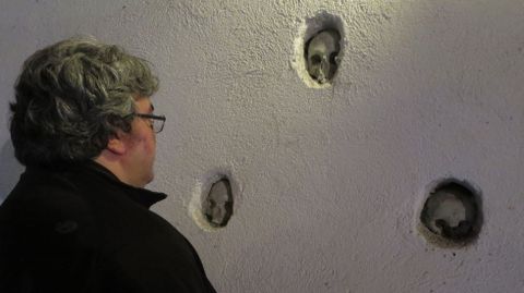 Cráneos de antiguos monjes empotrados en un muro adornan el atrio del templo de San Salvador do Val do Mao, en el municipio lucense de O Incio