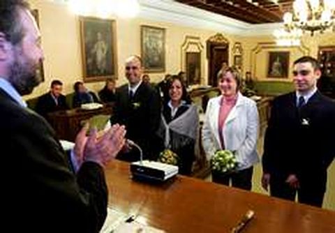 04 mar 2006 . Actualizado a las 06:00 h.En la casa consistorial de Lugo, que como se sabe es el edificio de la provincia en el que se celebran más bodas, tuvo lugar ayer una ceremonia por partida doble, con la particularidad de que en las dos bodas eran parte dos hermanos, circunstancia que se registró por primera vez, tal y como destacó el oficiante, el alcalde. Con un ligero retraso casi imprescindible en cualquier casorio, poco después de la una de la tarde contraían nupcias en el salón se sesiones José Miguel Viña Veiga con Vanesa Vilela Castro y José Eduardo Álvarez Vázquez con Mónica Viña Veiga. Todos ellos son de Lugo, aunque José Miguel y Vanesa vivirán al menos la próxima temporada en A Coruña, ciudad en la que está la unidad militar a la que pertenece él. Fue una ceremonia sencilla, con poco más de una veintena de invitados que se debatían entre una especie de alegría contenida y una tristeza inesperada. El motivo fue que por la mañana había fallecido el abuelo paterno de Vanesa, que una semana antes había tenido un problema cardiovascular. El alcalde, que no tuvo conocimiento de la parte luctuosa hasta que finalizó la ceremonia, manifestó su satisfacción por casar por primera vez a dos parejas en un mismo acto, con la particularidad de ser de dos hermanos. Dijo que habitualmente los contratos que se hacen en el Concello están relacionados con propiedades y cuestiones materiales. Les leyó los preceptivos artículos legales recordándoles las obligaciones que iban a adquirir y, cuando tocó el turno de su disertación, les dijo que no se preocupasen, que iba a leerles unos poemas. A José Miguel y Vanesa, que se mostraron un poco más cortados a la hora de celebrar el «sí, quiero» con el consabido beso, les dedicó uno de Darío Xoán Cabana, «poeta da Terra Chá extraordinario e gran novelista, que traballa nesta casa». A José Eduardo y Mónica les leyó otro del samonense Fiz Vergara Vilariño, fallecido hace años, del que dijo que «foi un poeta que sufriu moito». Tras dar por concluida la ceremonia, el mandatario mantuvo una corta tertulia coin varios de los presentes, algunos de los cuales no habían estado nunca allí.