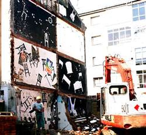 12 jul 2006 . Actualizado a las 07:00 h.El artista Iago Eireos se caracteriza por combinar pintura, escultura y fotografía, y por sus habituales actuaciones sobre paredes y planos verticales. Todo esto está presente en su trabajo actual pero supo darle una nueva perspectiva. También está pendiente de una prueba que le podría dar acceso a una beca de la Fundación Antonio Gala, que le permitiría desarrollarlo con más medios y tiempo. «Básicamente, busco casas que van a ser derribadas y pinto murales en las paredes medianeras que, tras el derribo, quedan como fachadas temporales. Cuando las tiran hago fotos que luego selecciono como material expositivo», explica el artista, que alude a un precedente, cuando actuó sobre espacios degradados, en los que introdujo objetos de uso diario que luego fotografió. De su nuevo proyecto hizo dos intervenciones en Pontevedra y otras dos en Lugo. Aquí una fue en la zona de O Castiñeiro, pero ya tiraron la casa, y la otra es en la calle Río Navia, que aún está visible. Eireos explica el proceso y los materiales que usa. «Empleo pintura acrílica y hago temas relacionados con la huella que dejan las personas y el paso del tiempo. Pinto objetos personales y todo lo que pudo rodear a quien estuvo allí». En algunos trabajó durante dos meses todos los fines de semana y en otros lo hizo 15 días o un mes diariamente. «No me da pena que los murales sean efímeros; al contrario porque eso es parte del proceso, pero la obra es la que queda fotografiada», explica. El artista también habla de la reacción de los obreros que trabajan en esas casas. «Les llama la atención y me preguntan por qué lo hago, si me pagan o, simplemente, me toman el pelo. Son un mundo aparte», concluye.