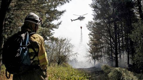 En la extinción del incendio registrado en la mañana de ayer en San Fiz, iniciado en una antigua cantera, usada como vertedero durante un tiempo, participaron un helicóptero, dos aviones, una carroceta de Medio Ambiente y bomberos de Lugo.